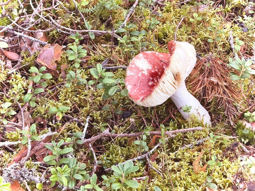 Lungo tutti i sentieri c’erano numerosissimi frutti di bosco e parecchi finlandesi con il secchiello che li raccoglievano (in tutta la Finlandia la raccolta dei prodotti del bosco è libera e garantita per legge), ho trovato anche numerosi funghi, ma visto che erano in bella mostra e nessuno li aveva raccolti, ho qualche dubbio sul fatto che fossero commestibili. Di solito qui raccolgono un fungo giallo con cui fanno zuppe e salse di cui vanno letteralmente matti.